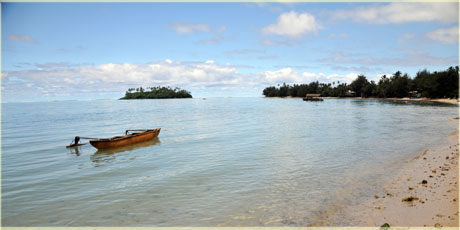 On Muri lagoon a canoe and Captain Tamas boat with motu Taakoka in the distance. Meitaki for the photos.